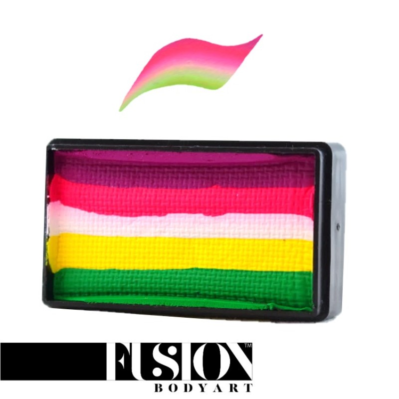 Fusion Body Art’s split cakes just require a flat face painting brush and water to get started. For flowing cheek art designs use a 1” flat brush to load all of the colours in the split cake or use smaller flat brushes to just pick up a few of the colours. Make sure to start with a slightly damp brush and add more water as needed by just dipping one corner of the brush lightly into your water. If you are new to 1 stroke face painting, the internet is filled with tons of amazing 1 stroke design ideas to inspire you. This method of face painting will save you a lot of time, and it will impress your clients as they watch these beautiful Fusion Body Art colours flow off your brush at the same time. You can also load your split cakes with small face painting sponges or round daubers. When using sponge, dab the colours onto the skin where you would like them, gently patting back and forth until all of the colours are even and bold.